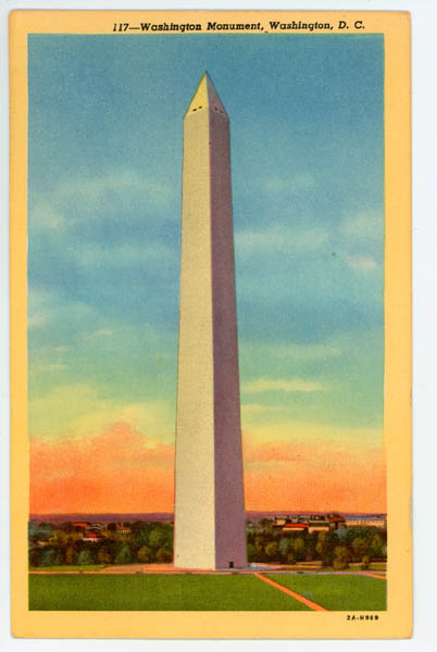 Description: at Washington is a stupendous shaft of granite, 555 feet 5 1-3 inches in height. It is 55 feet square at the base, 34 feet at the top, and terminates in a pyramid of pure aluminum. The foundation of rock and cement is 36 feet deep, 125 feet square. The cornerstone was laid 1848, the Monument was finished in 1885. It is the highest work of masonry in the world.