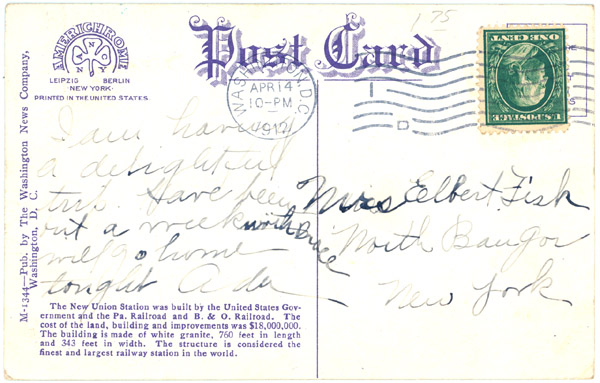 Description: The New Union Station was built by the United States Government and the Pa. Railroad and B. & O. Railroad. The cost of the land, building and improvements was $18,000,000. The building is made of white granite, 760 feet in length and 343 feet in width. The structure is considered the finest and largest railway station in the world.