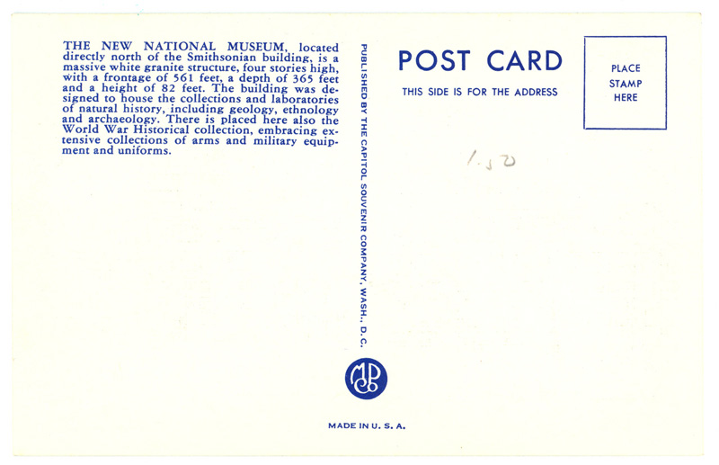 Description: THE NEW NATIONAL MUSEUM, located directly north of the Smithsonian building, is a massive white granite structure, four stories high, with a frontage of 561 feet, a depth of 365 feet and a height of 82 feet. The building was designed to house the collections and laboratories of natural history, including geology, ethnology and archaeology. There is placed here also the World War Historical collection, embracing extensive collections of arms and military equipment and uniforms.