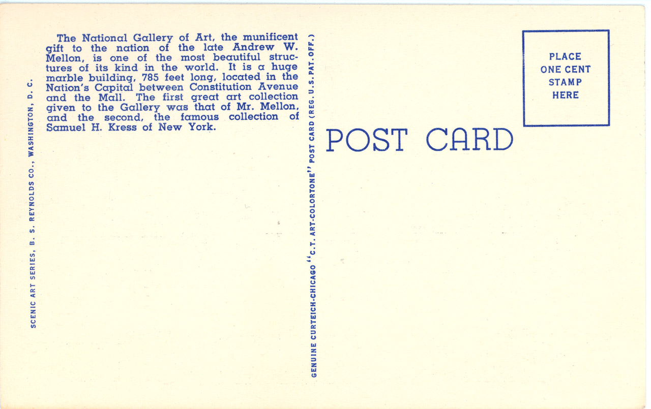 | Description: | The National Gallery of Art, the munificent gift to the nation of the late Andrew W. Mellon, is one of the most beautiful structures of its kind in the world. It is a huge marble building, 785 feet long, located in the Nation's Capital between Constitution Avenue and the Mall. The first great art collection given to the Gallery was that of Mr. Mellon, and the second, the famous collection of Samuel H. Kress of New York. |