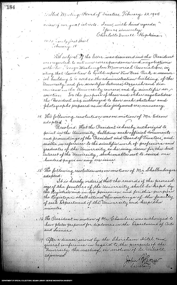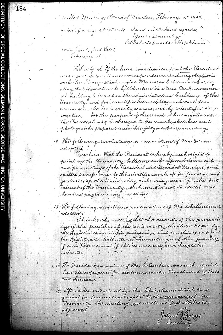 | Title: | February 20, 1904 Columbian University Board of Trustees Meeting Minutes |