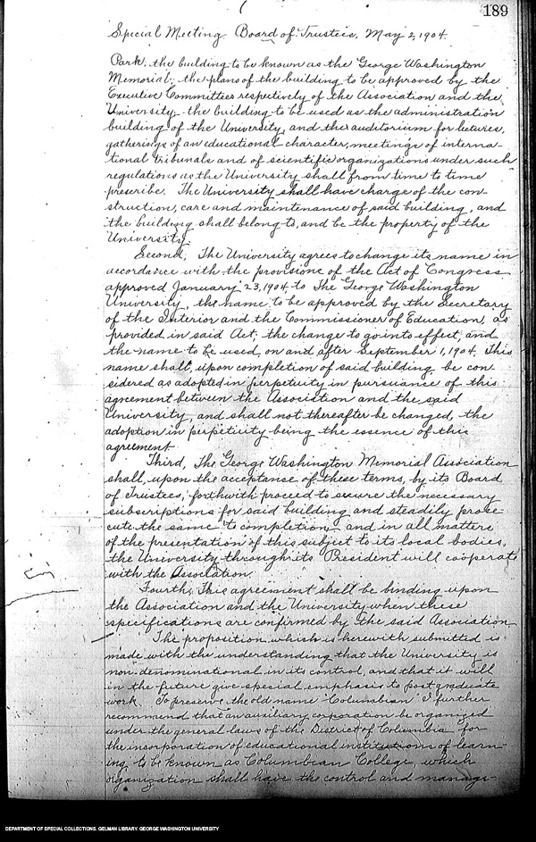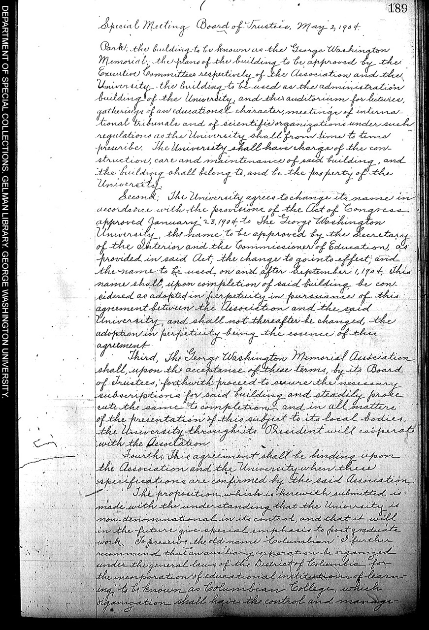 Description: At this meeting of the Board of Trustees, University President Charles Needham submitted the resolutions adopted by the Executive Committee of the George Washington Memorial Association. Detailed are the provisions for the building of the George Washington Memorial Building and the changing of the University name to the George Washington University. The history of the George Washington Memorial Association is also outlined and an acceptance of the proposals by the Columbian University Alumni Association is submitted.