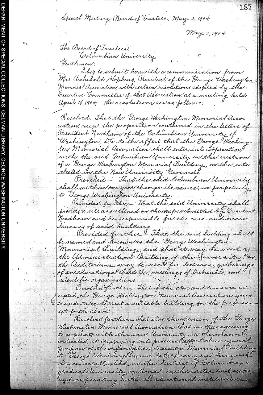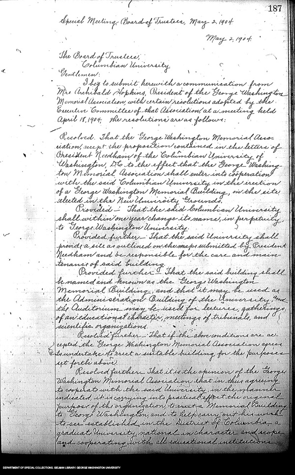 Description: At this meeting of the Board of Trustees, University President Charles Needham submitted the resolutions adopted by the Executive Committee of the George Washington Memorial Association. Detailed are the provisions for the building of the George Washington Memorial Building and the changing of the University name to the George Washington University. The history of the George Washington Memorial Association is also outlined and an acceptance of the proposals by the Columbian University Alumni Association is submitted.