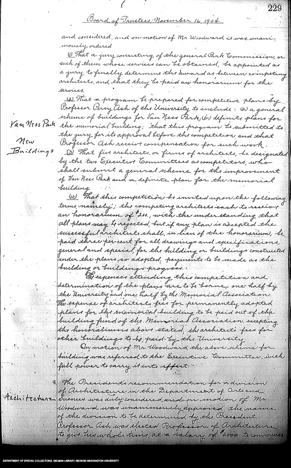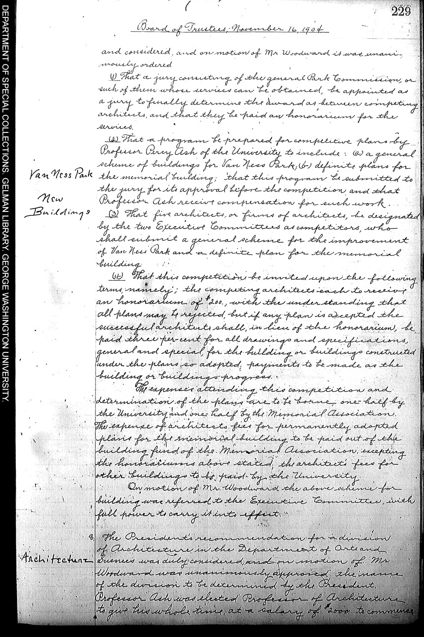 Subjects: Columbian University;; George Washington University;; Board of Trustees;; minutes;; Percy Ash;; architect;; Van Ness Park;; competition;; seal;; colors;; buff and blue;;