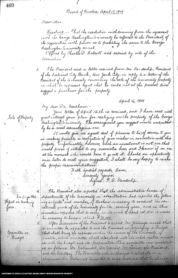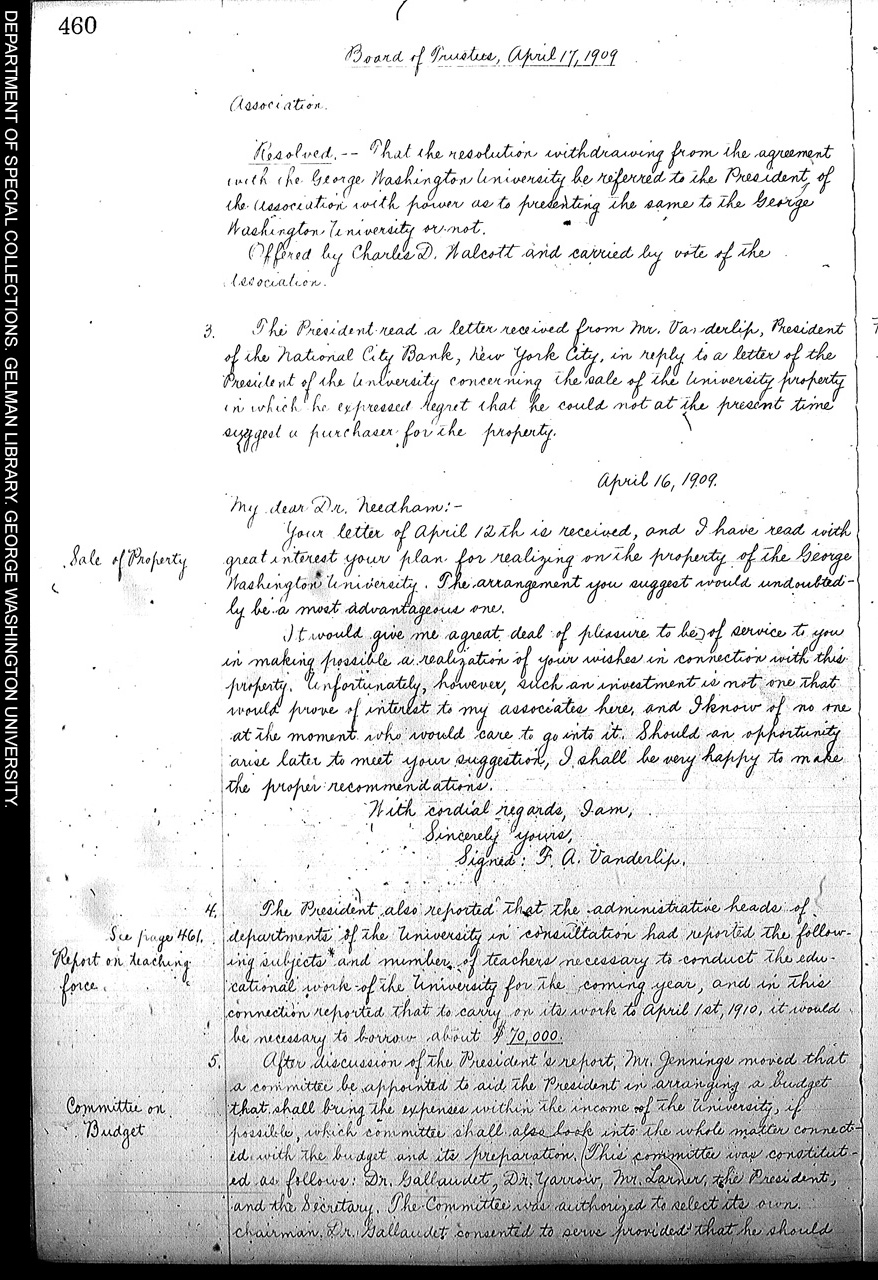 Title: April 17, 1909 Columbian University Board of Trustees Meeting Minutes