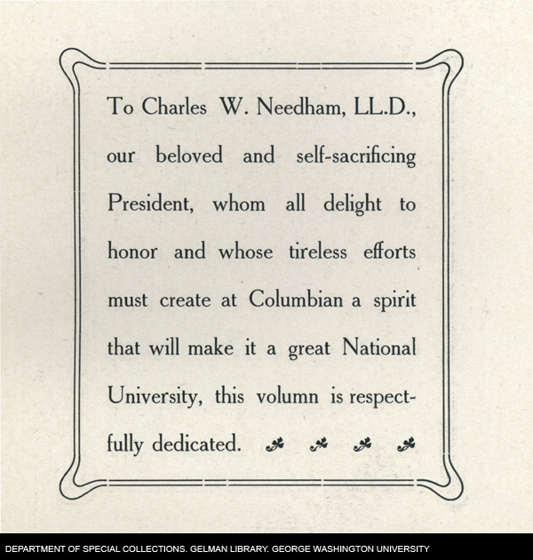 | Description: | A dedication to University President Charles Needham in the Cherry Tree (student yearbook), 1904. President Needham instigated the changes in the University by contacting the George Washington Memorial Association and offering a partnership. |
