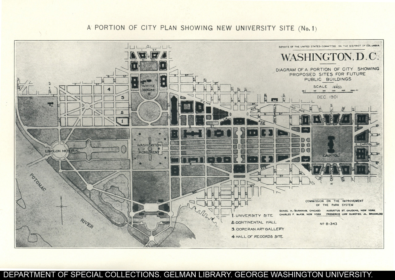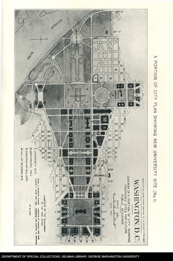 | Description: | This map, from the 1904 Columbian University Bulletin, displays the proposed sites for future University buildings. The map emphasizes the University's closeness to the center of Washington, D.C. and its government buildings. |