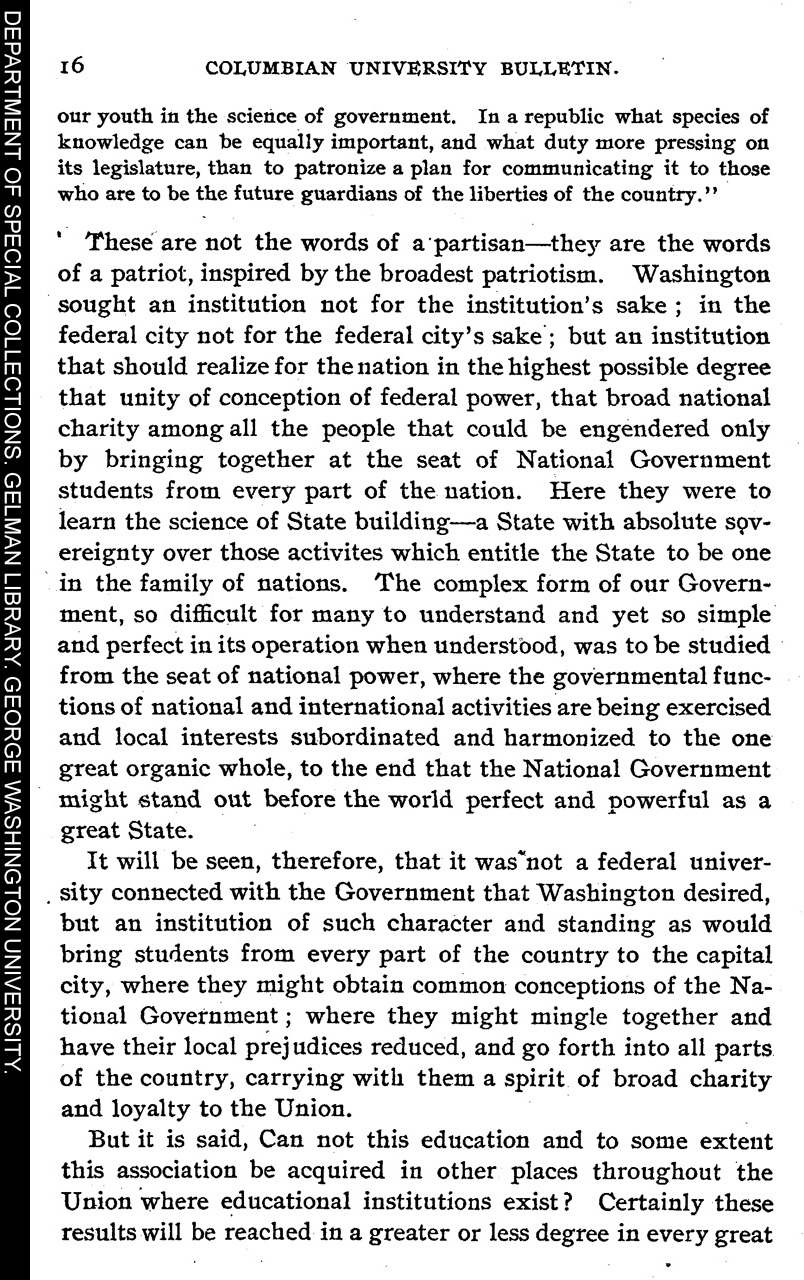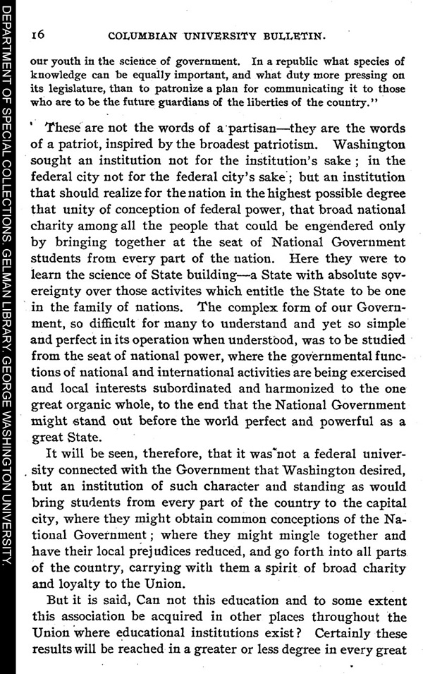 | Description: | The 1904 Columbian University bulletin, Alumni Number, explains the reasoning behind the partnership with the George Washington Memorial Association. The text includes a section on "Washington's Policy of National Education," which examines several of Washington's writings that display his desire for a national university. The text claims that the George Washington University is being founded to satisfy the first President's wishes and that the University will become the "more perfect union" so much desired by Washington and by all patriotic men and women throughout the land. |