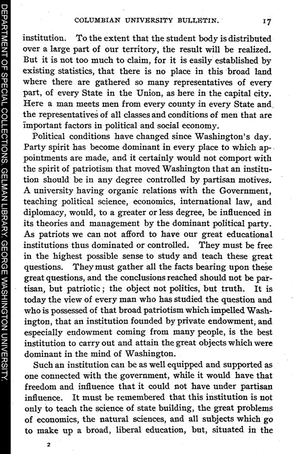 Description: The 1904 Columbian University bulletin, Alumni Number, explains the reasoning behind the partnership with the George Washington Memorial Association. The text includes a section on "Washington's Policy of National Education," which examines several of Washington's writings that display his desire for a national university. The text claims that the George Washington University is being founded to satisfy the first President's wishes and that the University will become the "more perfect union" so much desired by Washington and by all patriotic men and women throughout the land.