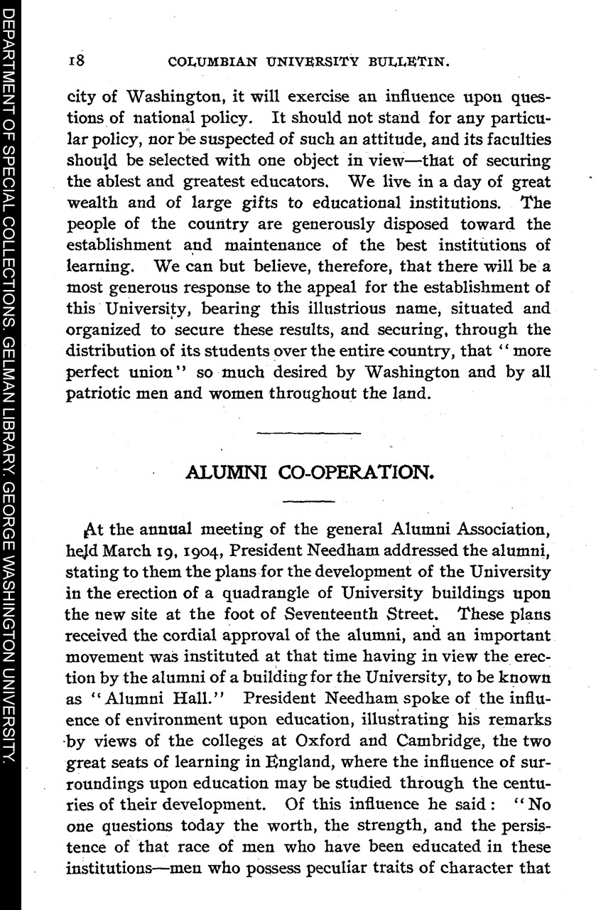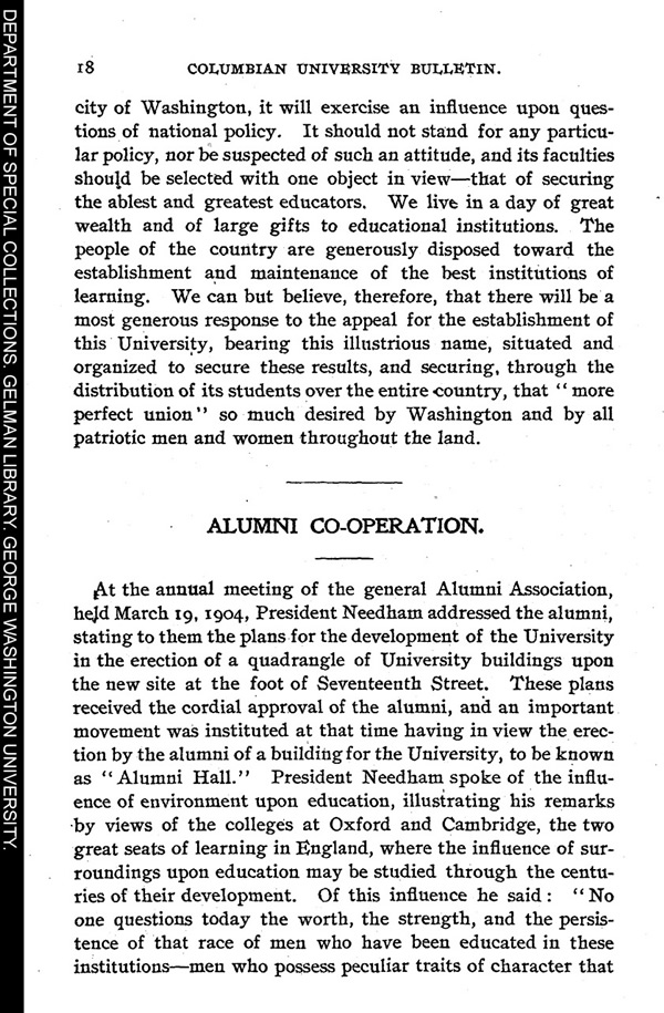 Description: The 1904 Columbian University bulletin, Alumni Number, explains the reasoning behind the partnership with the George Washington Memorial Association. The text includes a section on "Washington's Policy of National Education," which examines several of Washington's writings that display his desire for a national university. The text claims that the George Washington University is being founded to satisfy the first President's wishes and that the University will become the "more perfect union" so much desired by Washington and by all patriotic men and women throughout the land.