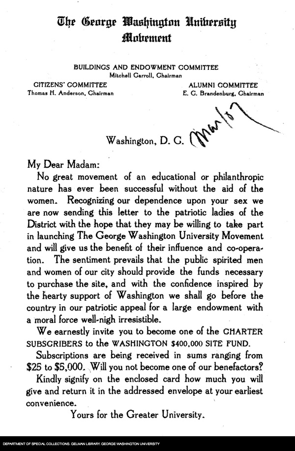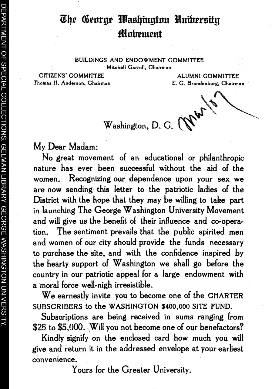 | Description: | This fundraising letter, part of the "George Washington University Movement" of 1907, is addressed to "My Dear Madam" and invites "public-spirited" women to donate to the building fund of the University. It is acknowledged that the task cannot be done without the help of the recipient's "sex" and notes that received subscriptions have ranged from $25 to $5,000. |