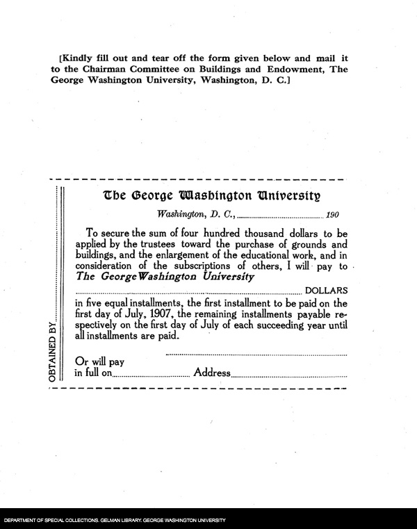 | Description: | This form asks the potential subscriber to "kindly fill out and tear off" the form in order to pledge their donation, to be made in "five equal installments," beginning on July 1, 1907. This form was part of the "George Washington University Movement," a fundraising campaign organized with the goal of raising $400,000 for the purchase of grounds and buildings. |