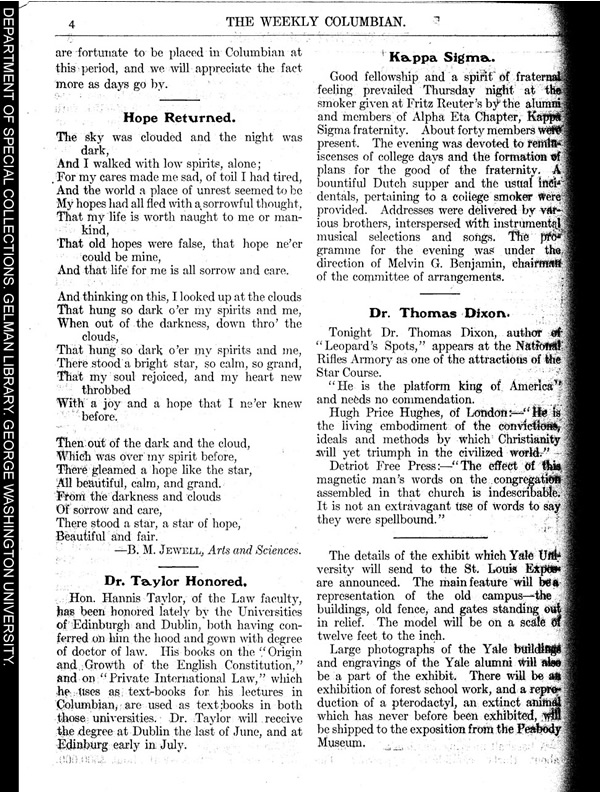 Description: A short blurb from the March 2, 1904 The Columbian Weekly, the student newspaper that informs readers, "events of the greatest importance are taking place at Columbian," including the construction of new buildings.