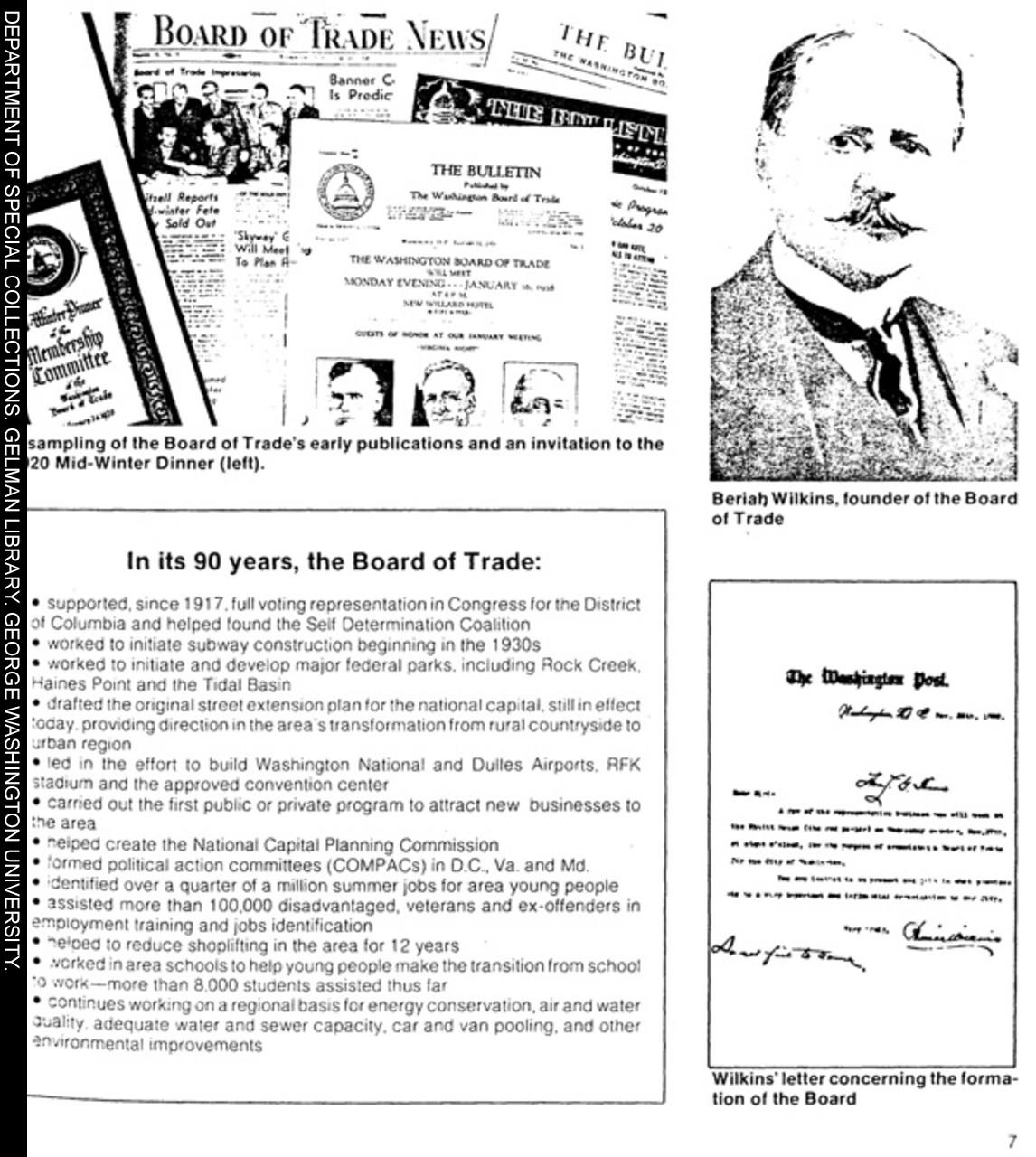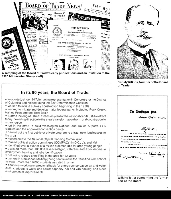 This is a two panel brochure sent to metro area businesses advertising the Board to prospective members. This brochure outlines the accomplishments over the past 90 years of the Board of the Trade, offers a very brief history of the Board, and looks to the future. The Board emphasizes their work in infrastruture development, transportation issues with the Dulles, National, and the Metro; social programs related to employment and education, and cultural venues with the Kennedy Center, RFK Stadium, and the forthcoming covention center.