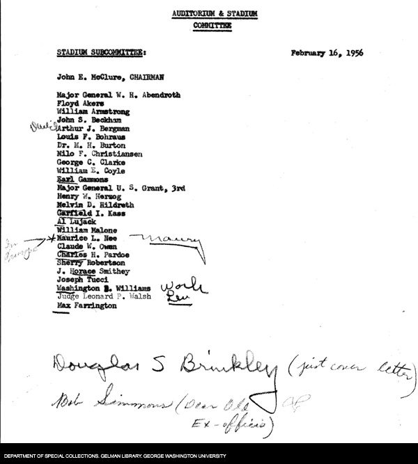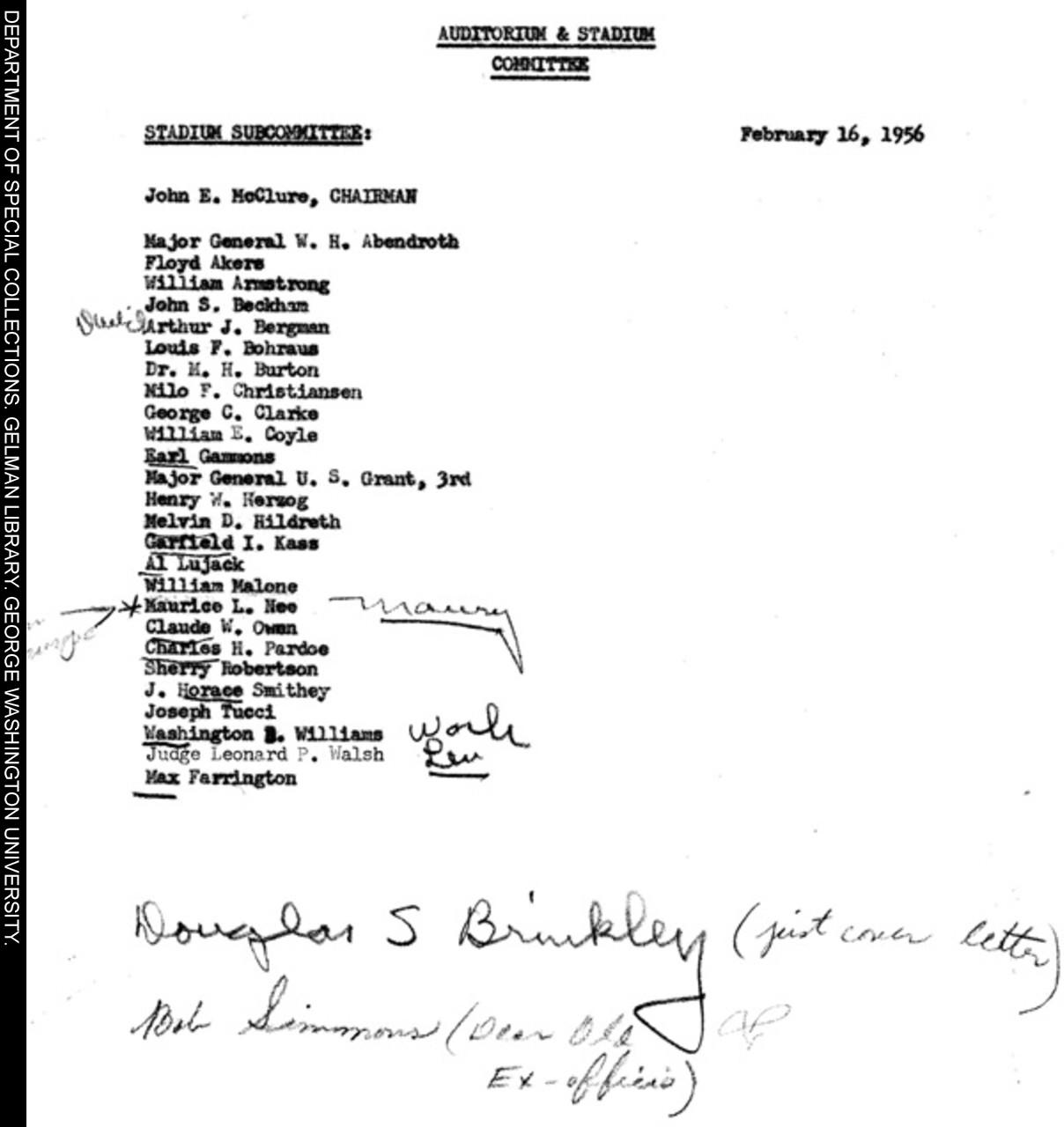 The first document shows the formation of a stadium subcommittee in February of 1956 under the umbrella of the Auditorium and Stadium Committee. Their mission was to advocate the passage of the needed Congressional approval to make the National Memorial Stadium a reality. The subcommittee include notable members such as Sherry Robertson, a member of the Washington Senators front office; Floyd Akers, an major auto dealer in D.C.; Arthur "Dutch" Bergman, former head coach of the Washington Redskins; Earl Gammons, director of the CBS News Washington D.C. office; Democratic party official Melvin D. Hildreth; commerical real estate developer Garfield Kass; former Washington professional basketball player Al Lujack; among many others including retired military officers and a federal judge.
