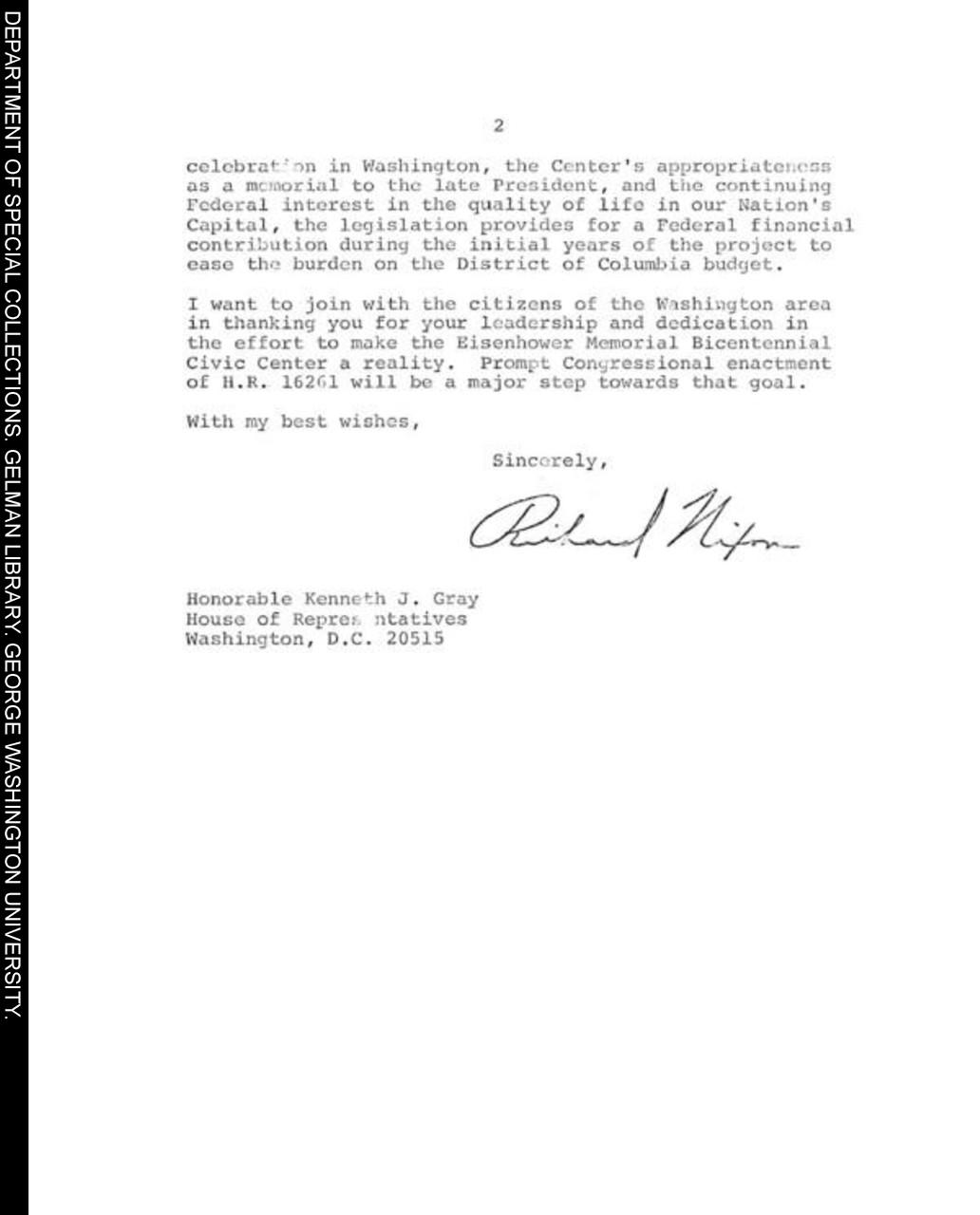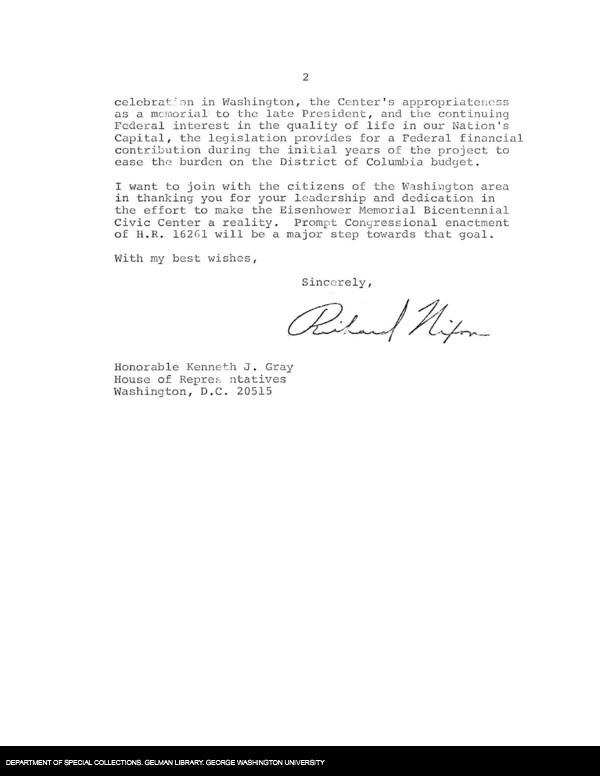 | Description: | Two days after the open letter, President Nixon responds with a letter to Congressman Kenneth J. Gray (D-Ill.), chairman of the House Public Works Committee, expressing his full support of H.R. 16261 to Gray as his committee was currently reviewing the legislation before the bill made its way to a vote before the full House and Senate. Nixon provides an unintended foreshadow into why Congress did not approve the Eisenhower Civic Center project when he referenced how the project will be financed. |