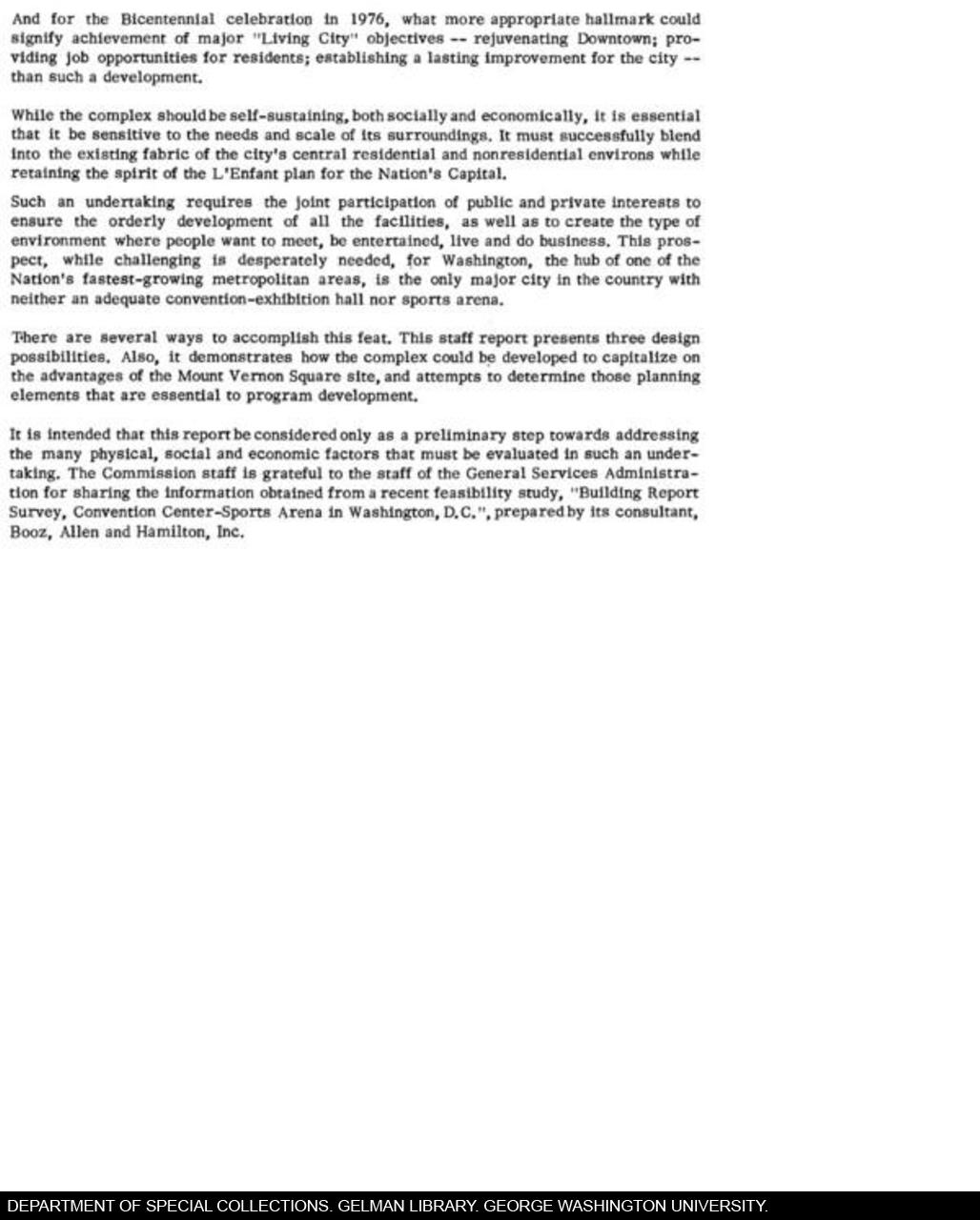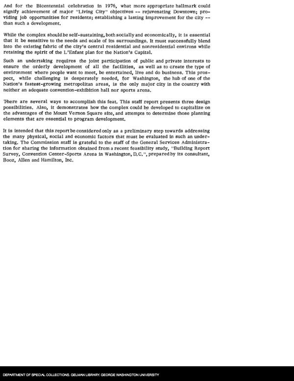 Description: These are the plans for the Convention / Sports arena complex as represented by H.R. 16261, "a bill to authorize construction of the Dwight D. Eisenhower Memorial Bicentennial Civic Center in downtown Washington." This booklet was prepared by the National Capital Planning Commission in concert with the Washington Board of Trade to present three design possibilities to the President and the Congress. As the central planning agency for the federal government, the Commission is responsible for preserving the appearance and design of the original L'Enfant plan for the District. The National Capital Planning Commission gives direction and final approval over the use of federal land and construction of buildings in the National Capital Region in order to protect the historical integrity of Washington D.C. urban planning.