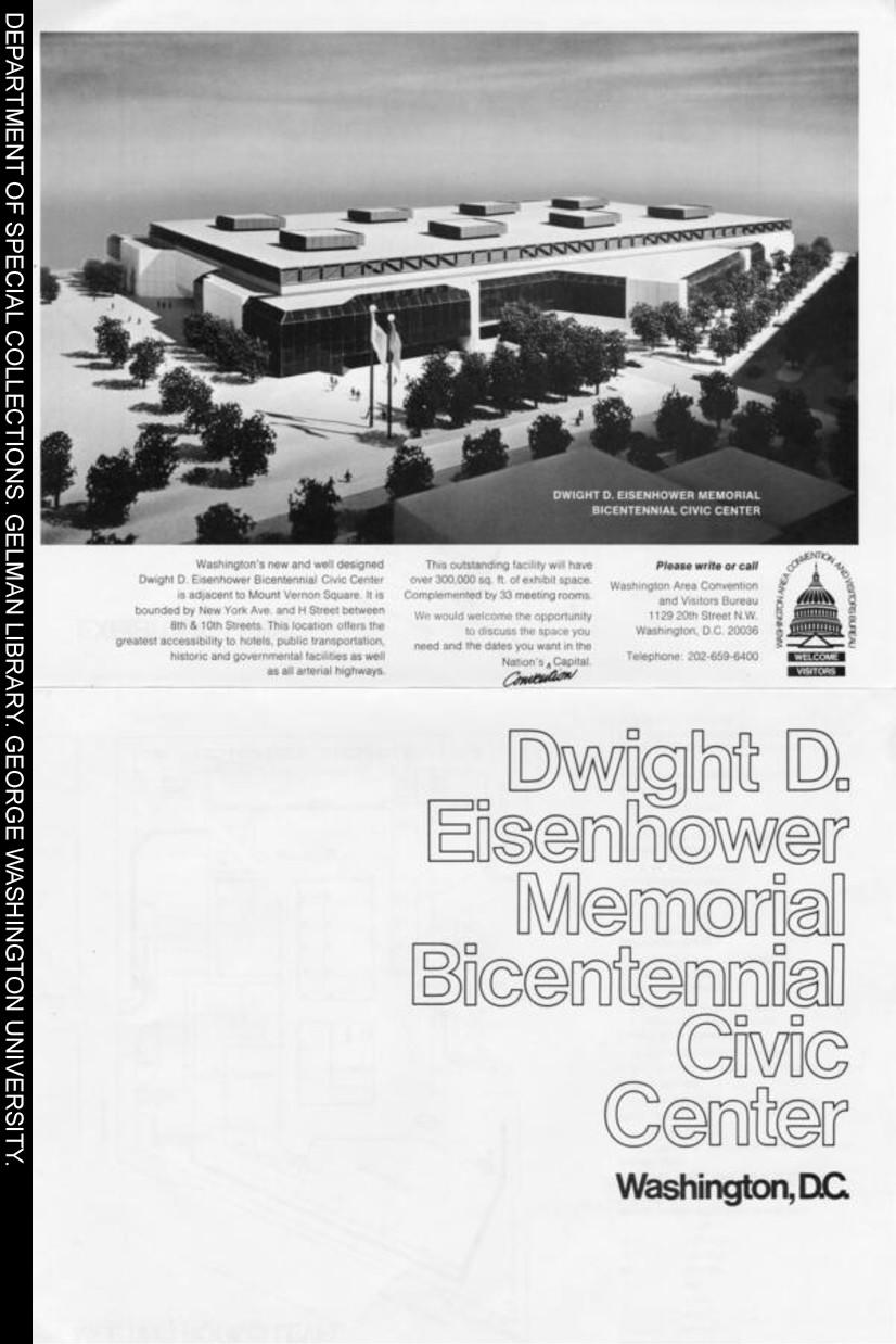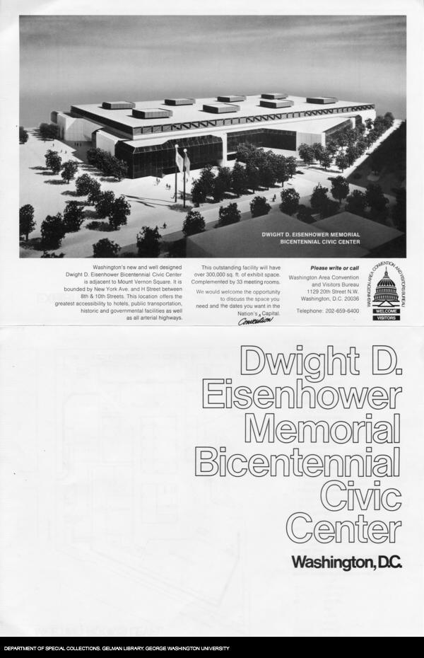 Description: In the hopes that H.R. 16261 would become a reality, the Washington Area Convention and Visitors Bureau produced this brochure for prospective exhibitors advertising the Eisenhower Civic Center as if it were in operation. The Washington Area Convention and Visitors Bureau was started by the Greater Washington Board of Trade in 1931 and became an independent organization in 1976.