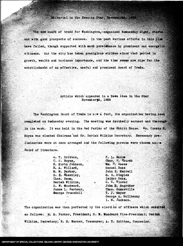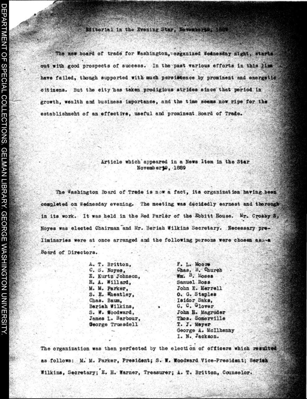 | Description: | Someone within the Washington Board of Trade took the time to transcribe a short editorial and a brief article from the November 29, 1889 edition of the now defunct Washington Star and place them in their records. The three sentence editorial reports to the city that the existence of the Board of Trade is now fact. It reports past efforts to organize such a body have failed, but the conditions are now perfect for such a civic organization to grow and flourish. The article states the Board has been organized in the parlor of the Ebbitt House the previous evening. It is significant that Crosby Noyes, head of the Washington Star, and Beriah Wilkins, head of the Washington Post, were elected Chairman and Secretary respectively. It speaks volumes as to the weight newspapers carried in the business community in the late nineteenth century. As well, it is interesting that the head of the Alexandria Board of Trade was in attendance and gave special remarks as to the benefits of organizing a board of trade. This speaks to unique nature of Alexandria predating the District and how it probably outpaced the District in development in some respects during the nineteenth century. |