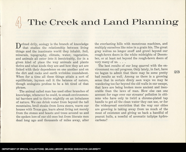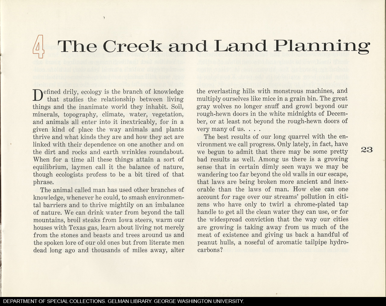 | Description: | This 1967 pamphlet serves to document concerns about the degrading health and increasing pollution plaguing Rock Creek Park. It was created by the U.S. Department of the Interior in order to spread the message about the hazards a growing city can pose to the surrounding environment. The pamphlet contains numerous photographs displaying the traumatic effect Washington, D.C. has had on one of the few remaining oases in the capital area. The greater importance of this document to Washington, D.C. history lies in its documenting the effort to maintain the elegance of the capital city. Additionally, The Creek and the City displays the conflict between man and nature which frequently is a subject of debate in the political institutions of the United States. |