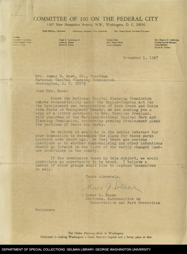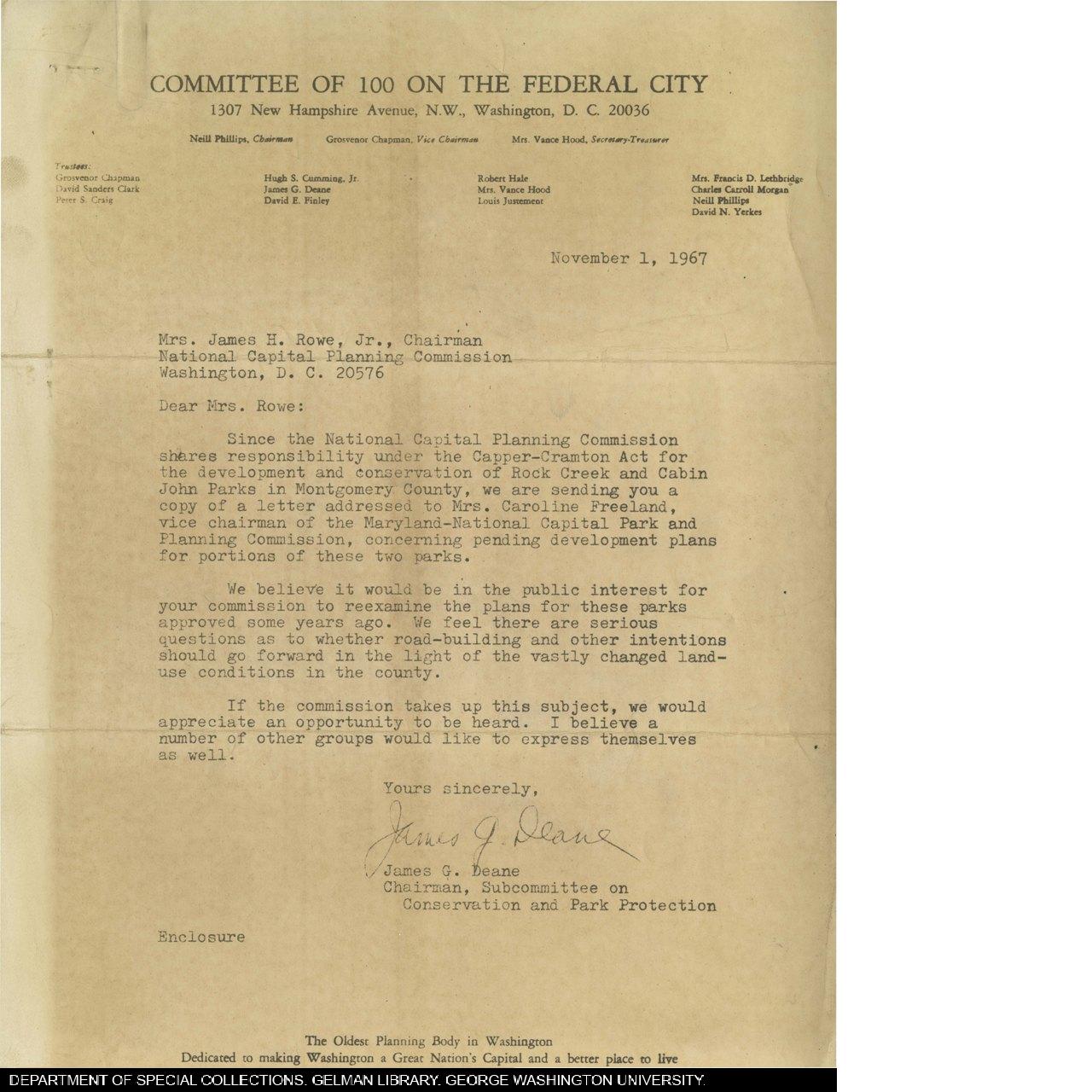 | Description: | This letter addresses the continuation of road building projects inside Rock Creek Park. It was created by D.C. and Montgomery County residents with a vested interest in preserving the tranquility of the park. Its historical importance lies in its broaching of the controversy over the need to preserve natural beauty in America's capital city against the requirements of urbanization and growth. |
