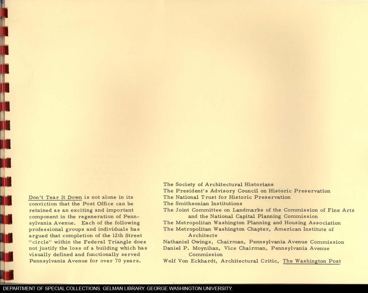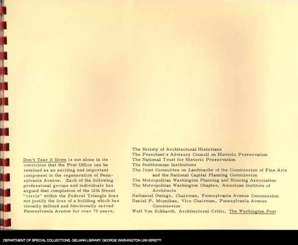 | Subjects: | Don't Tear It Down;; Old Post Office Building;; Pennsylvania Avenue;; Federal Triangle;; General Services Administration;; Internal Revenue Service;; L'Enfant, Pierre;; Pennsylvania Avenue Commission;; White House;; Capitol;; Society of Architectural Historians;; President's Advisory Council on Historic Preservation;; National Trust for Historic Preservation;; Smithsonian Institution;; Joint Committee on Landmarks;; Commission of Fine Arts;; National Capital Planning Commission;; Metropolitan Washington Planning and Housing Association;; American Institute of Architects;; Owings, Nathaniel;; Moynihan, Daniel P.;; Von Eckhardt, Wolf;; Wiebenson, John |