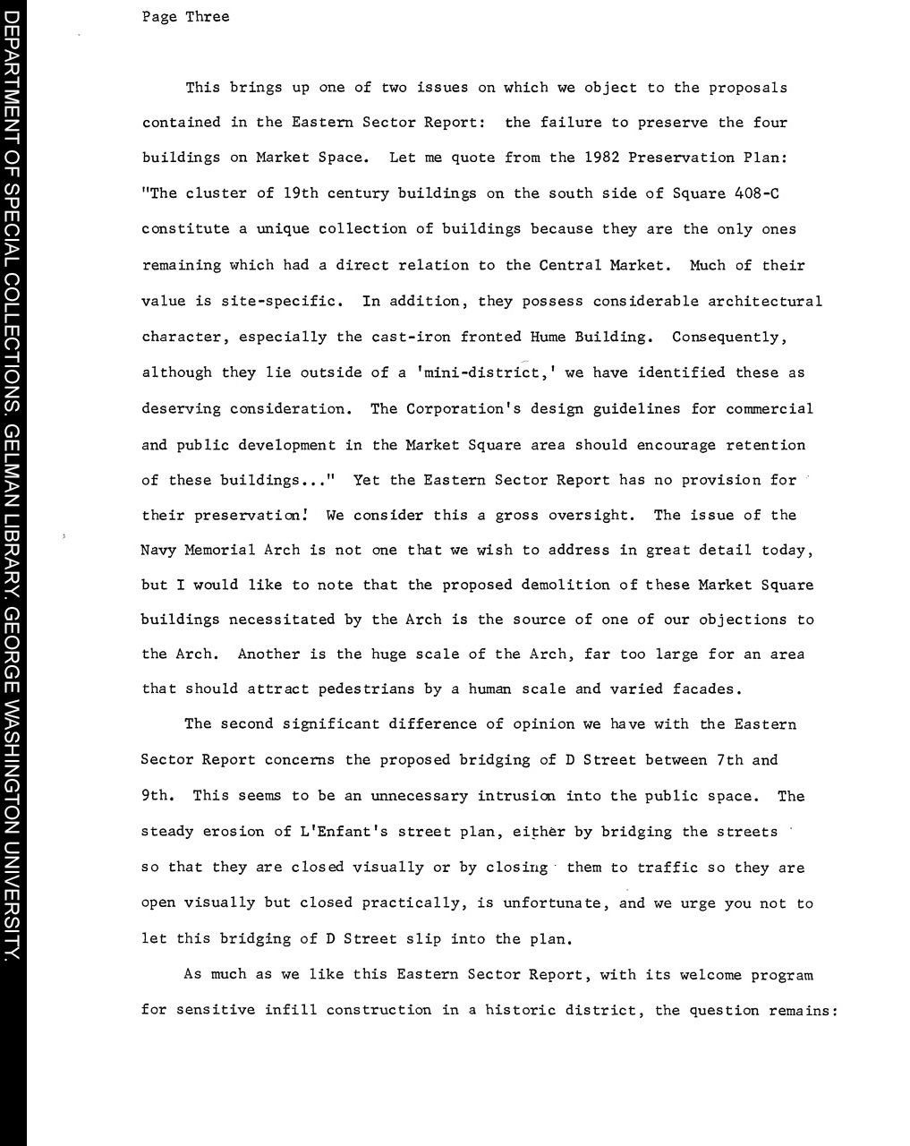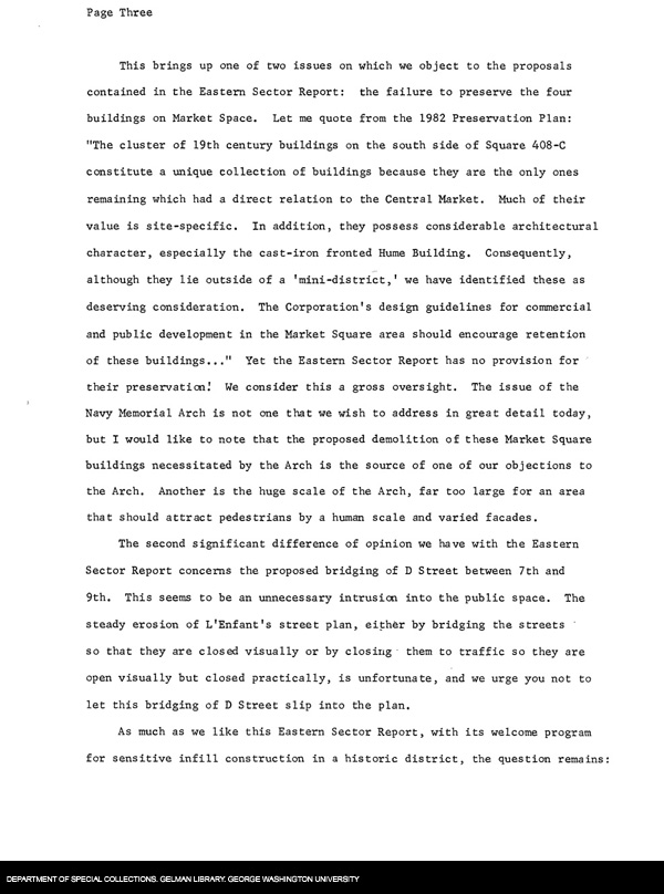 Description: This is a statement by Don't Tear It Down to the Pennsylvania Avenue Development Corporation regarding PADC's Eastern Sector Report outlining plans for that portion of the development area. The statement commends PADC's increased attention to preservation, but is still critical of some lapses.