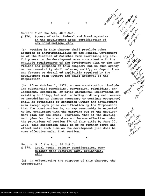 | Description: | This document is a recommendation to Congress to modify legislation so as to nullify a court decision allowing the Pennsylvania Avenue Development Corporation to demolish historic structures without approval of governing bodies. The document outlines the problem and then provides suggested solutions, stressing the need for prompt action. |
