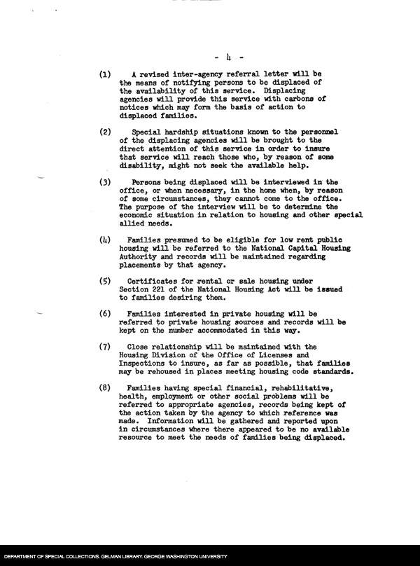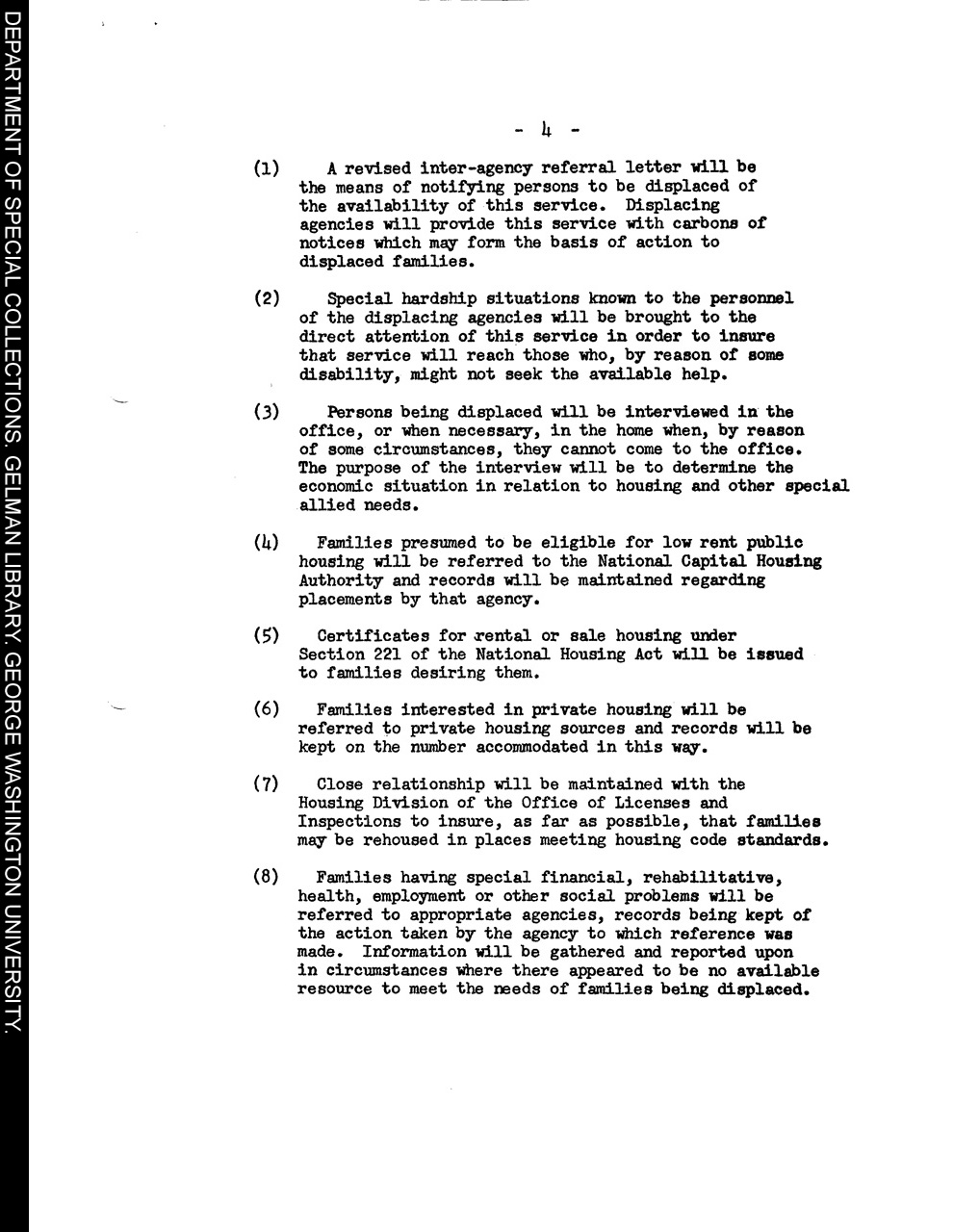 Description: Memo from the D.C. Department of Pubic Welfare outlining how the displacement of families from their houses by government agencies should be handled. In the memo, the Director of Public Welfare Gerard M. Shea, states his plan to establish an advisory committee to oversee all agencies involved in urban renewal and family displacement. Further, he proposes that the Landlord-Tenant Consultant Service, a division of the Department of Public Welfare, be expanded to handle the welfare needs of families that are displaced by government actions.