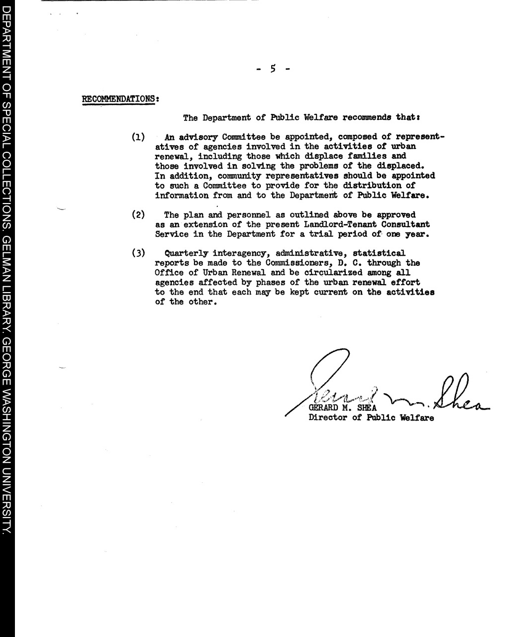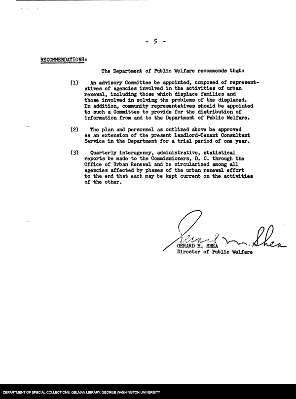 Description: Memo from the D.C. Department of Pubic Welfare outlining how the displacement of families from their houses by government agencies should be handled. In the memo, the Director of Public Welfare Gerard M. Shea, states his plan to establish an advisory committee to oversee all agencies involved in urban renewal and family displacement. Further, he proposes that the Landlord-Tenant Consultant Service, a division of the Department of Public Welfare, be expanded to handle the welfare needs of families that are displaced by government actions.
