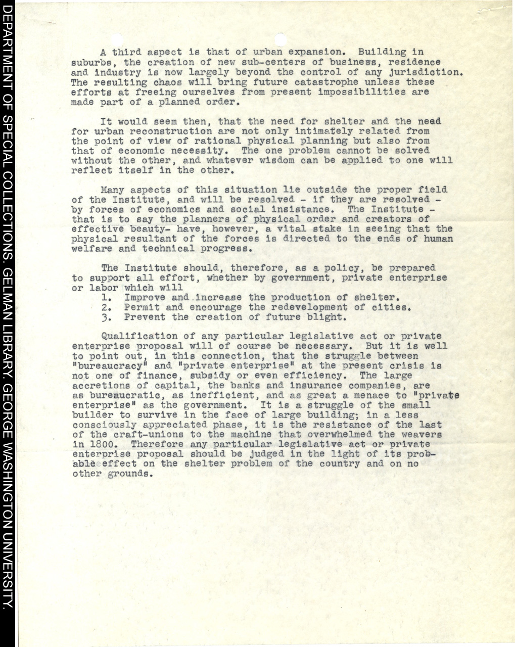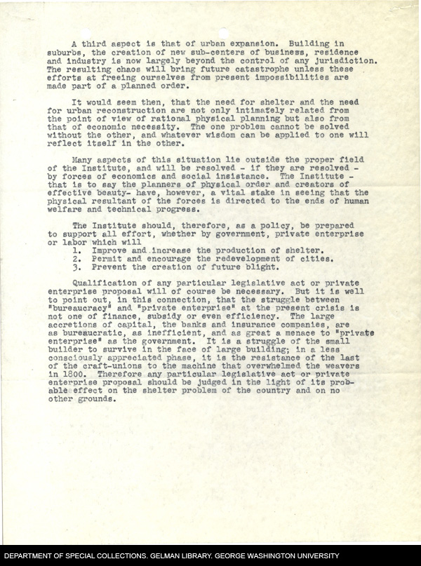 Description: Memo from Henry S. Churchill, a chairman of the Committee on Urban Planning at the American Intitute of Architects, arguing that AIA should not be included in a debate over private vs. public housing. Instead the AIA's objective should be to support any effort that provides for more adequate housing and encourages the redevelopment of cities. Therefore he believes subsidies are acceptable not as charity but as as a rational way that the gap can be filled between the cost of homes and what buyers can pay.
