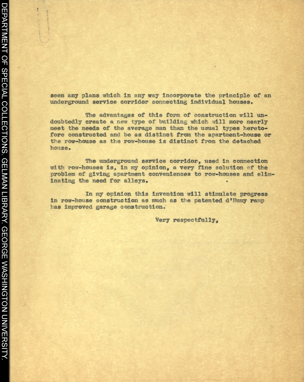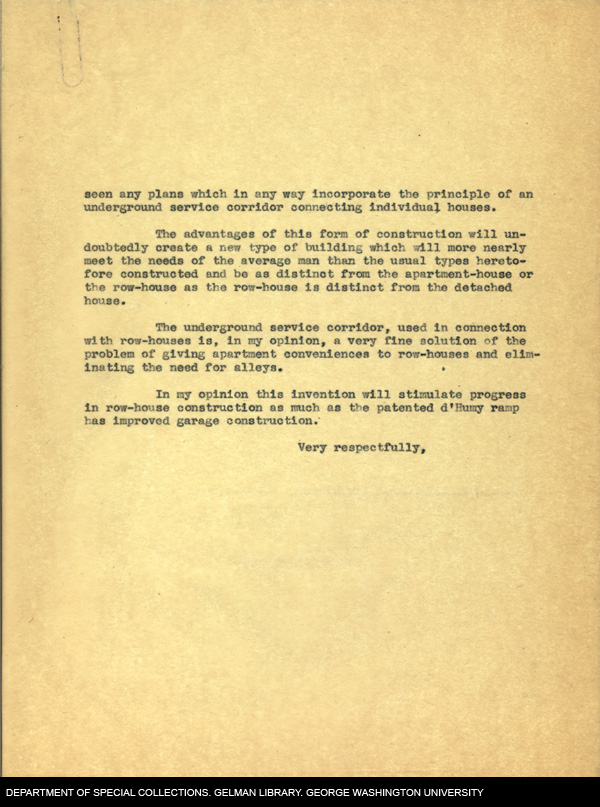 | Description: | The draft of a letter from an unknown person to the Commissioner of Patents arguing that Louis Justement's design for apartment houses was a new and useful invention. In the letter the author discusses the benefits of Justement's design and how it eliminates the need for alleys in row house construction. |