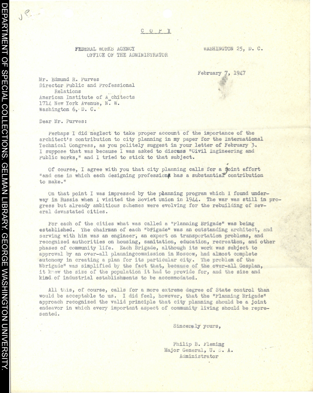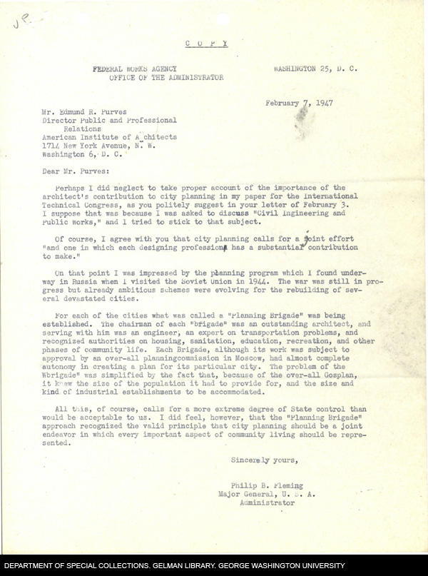 | Description: | A letter from the the Federal Works Agency Administrator, Major General Philip B. Fleming, to the Director of Public and Professional Relations at the American Institute of Architects, Edmund R. Purves. In the letter Fleming agrees with Purves that architects should be included in city planning. He explains that it is important for architects and engineers to work together and uses the establishment of "Building Brigades" in the Soviet Union in 1944 as an example of this type of cooperation. At the end of the letter he notes that the "Building Brigades" called for more state control then would be acceptable in the United States. |