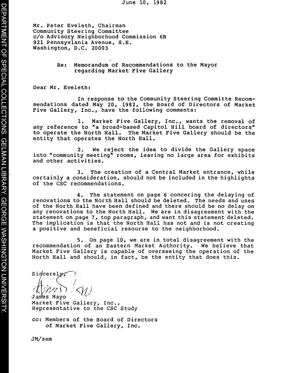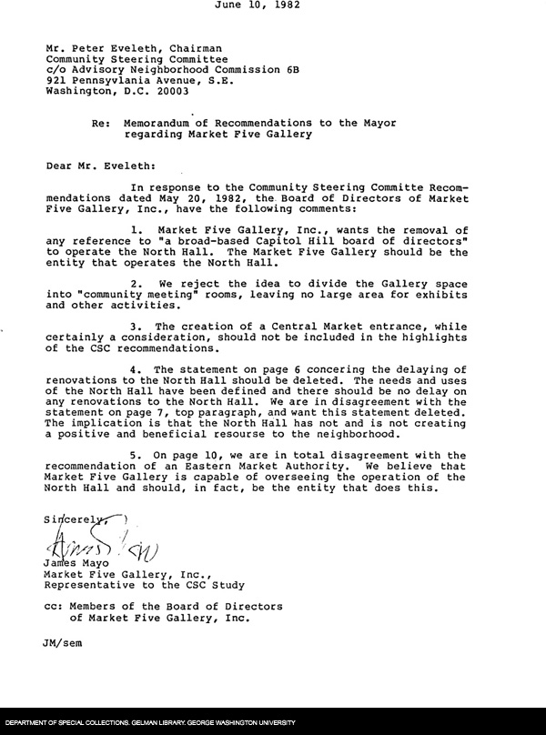 | Description: | Letter from the communty art gallery located in Eastern Market indicating specific objections to the Dewberry & Davis proposal. |