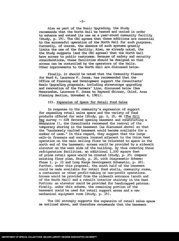 | Description: | Letter to Mayor Marion Barry with an attached report detailing the recommendations of the Citizens Steering Committee regarding the Eastern Market Area Study regarding the development and preservation of Eastern Market, as well as opposing viepoints and rebuttals. |