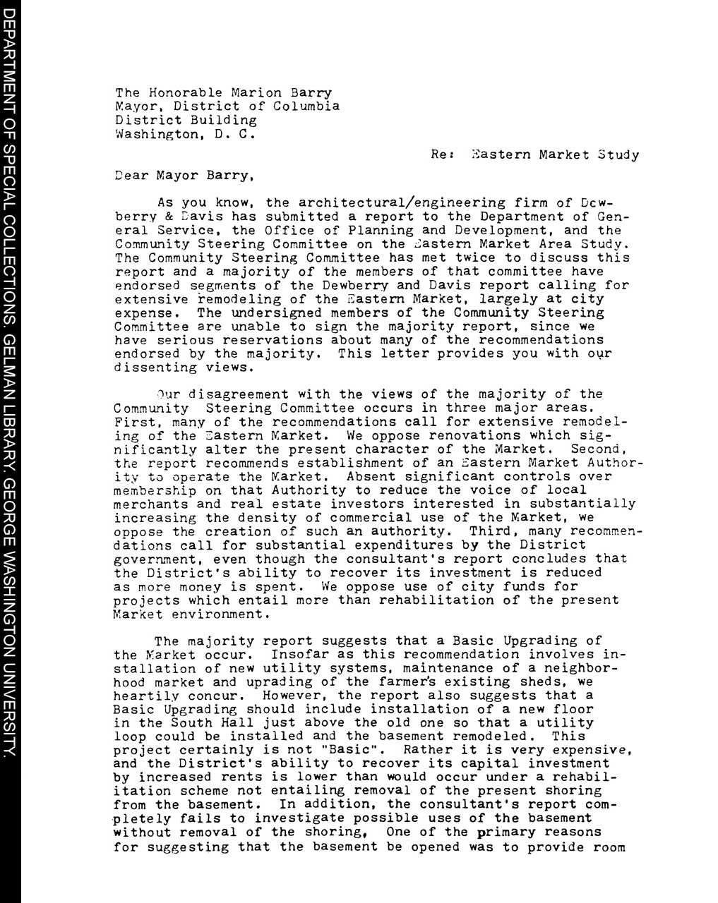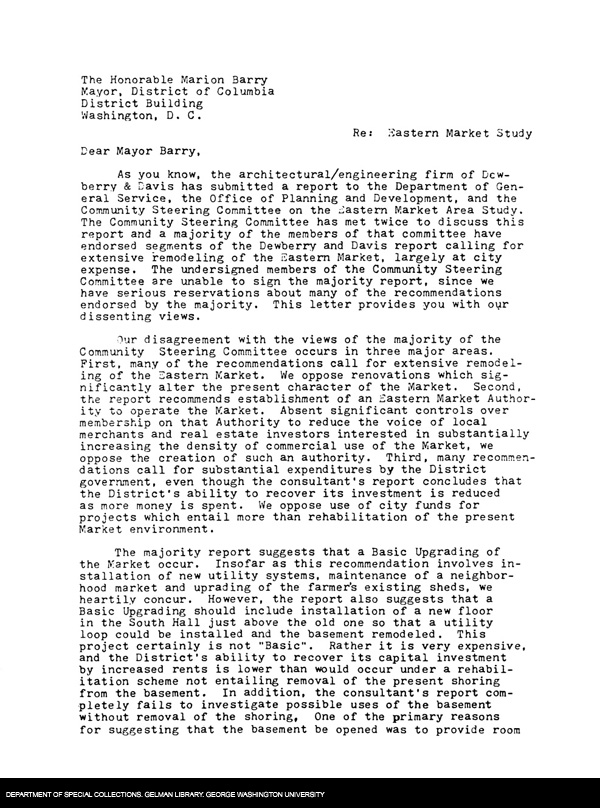 | Description: | This letter from the Ad Hoc Committee on the Eastern Market Study and several Eastern Market tenants to Mayor Marion Barry registers their opposition to the recommendations of the Citizens Steering Committee regarding the Eastern Market Area Study. |