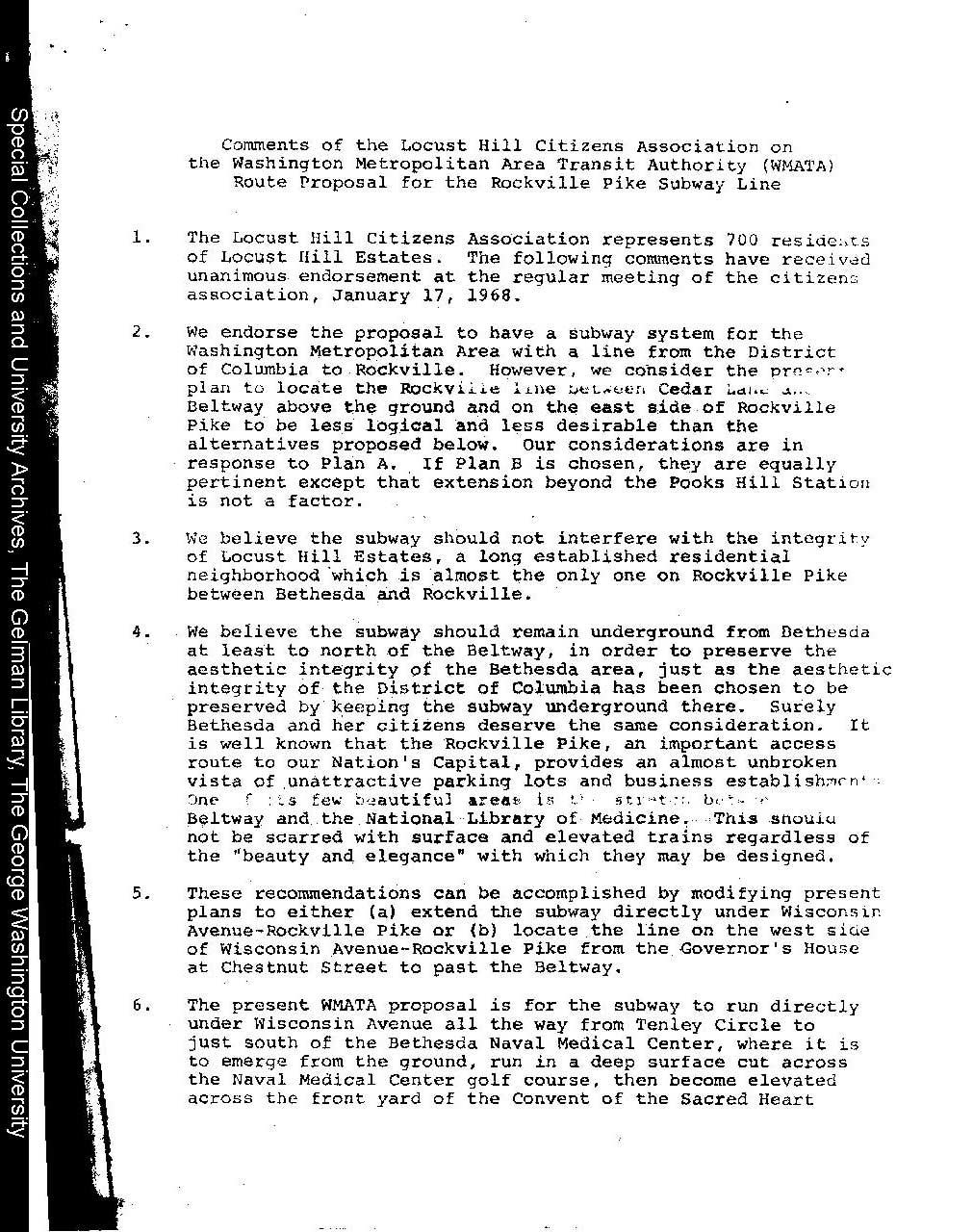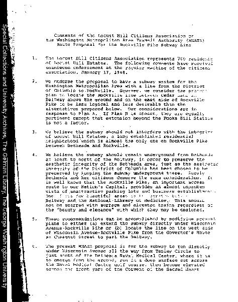 Description: Letter and statement from Locust Hill Citizens Association president W. King Engel to Congressman Gilbert Gude, complaining about the impact of the proposed Metro route on their neighborhood. They propose a rather complicated change of plans to minimize the impact on the area.