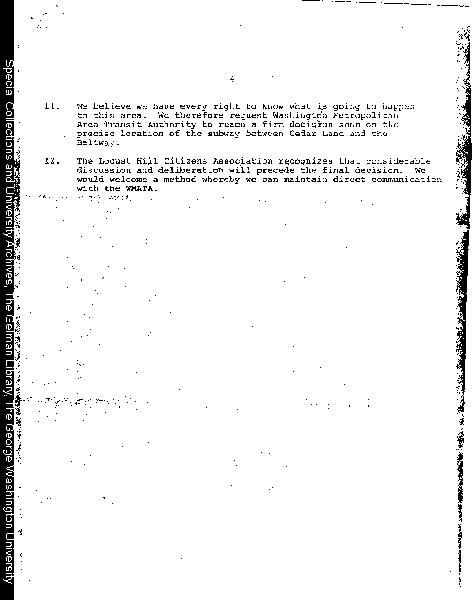 Description: Letter and statement from Locust Hill Citizens Association president W. King Engel to Congressman Gilbert Gude, complaining about the impact of the proposed Metro route on their neighborhood. They propose a rather complicated change of plans to minimize the impact on the area.