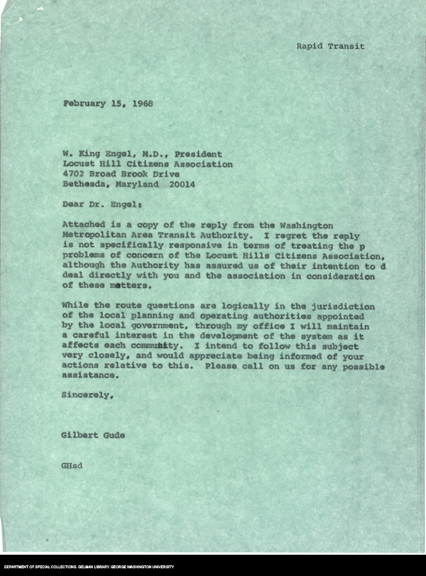 | Description: | Congressman Gilbert Gude's response to letter and statement from Locust Hill Citizens Association president W. King Engel complaining about the impact of the proposed Metro route on their neighborhood. They propose a rather complicated change of plans to minimize the impact on the area. Gude's letter states he will follow the problem, but that the planning agency has jurisdiction. |