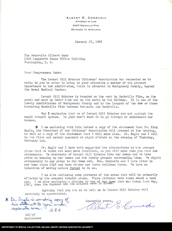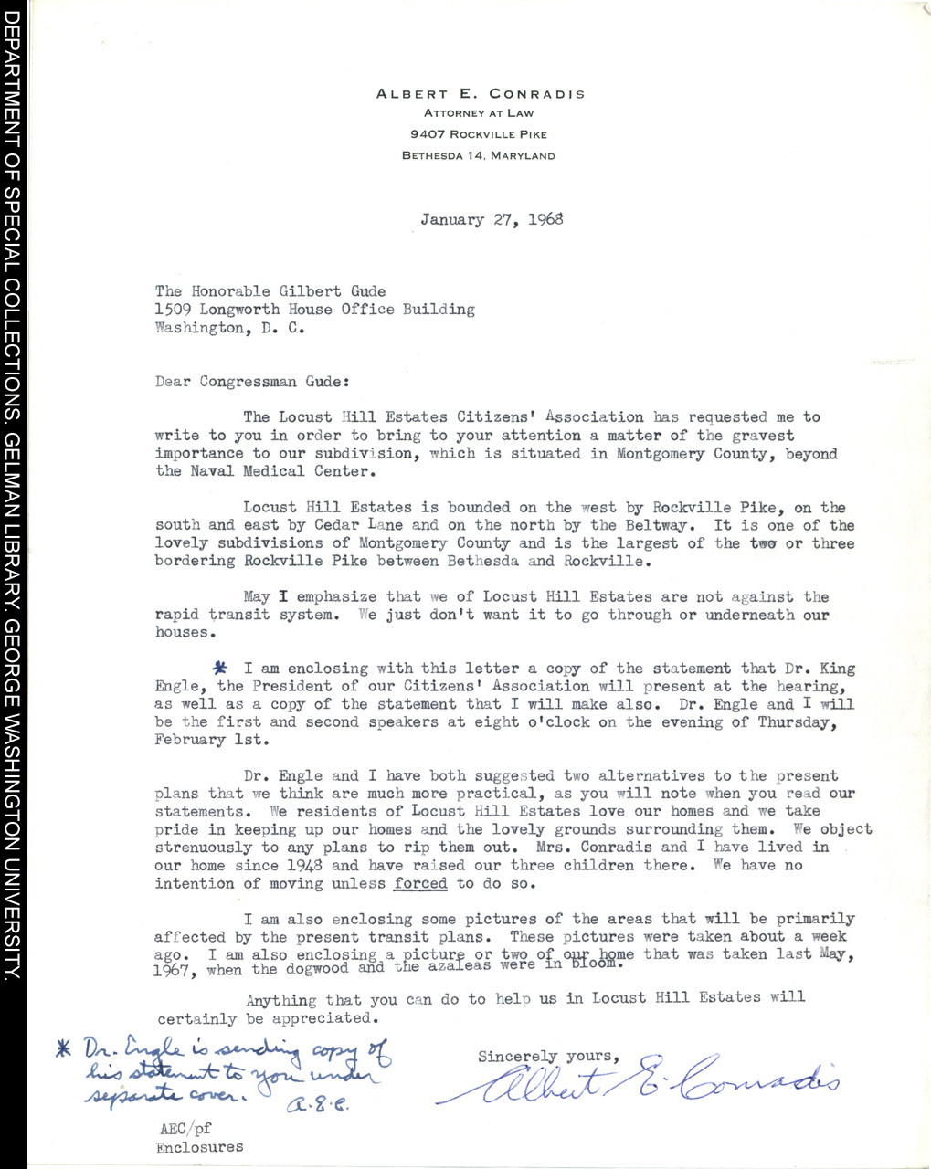 | Description: | Albert Conradis, of the Locust Hill Estates Citizens' Association of Montgomery County, wrote to Congressman Gilbert Gude about concerns regarding the planned Metro construction. Included were photographs of the neighborhood they were worried would be ruined by an above ground Metro line that was planned at that point. See also the Conradis statement, the Conradis Photos, the Gude letter to Conradis, and the Engle Letter referred to in this letter. |
