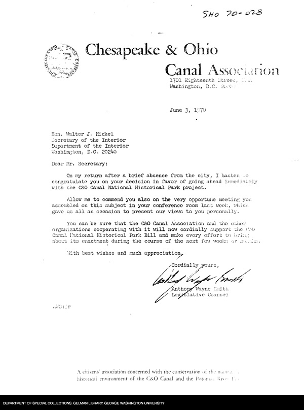 | Description: | A letter from Anthony Wayne Smith, legislative Council for the C & O Canal Association to the Secretary Of Interior Walter J. Hickel. The letter acknowledges Hickel's decision on supporting the advancement of the Bill to convert the C & O Canal to an Historical Park. The Canal Association offers its support for said Bill. |