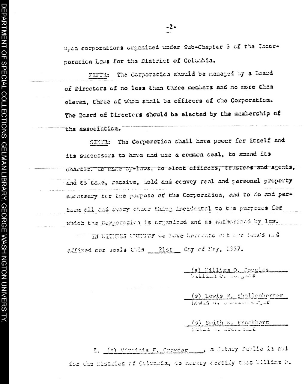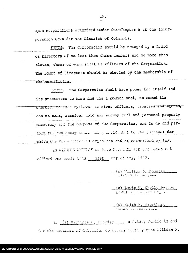 | Description: | The C & O Canal Association Certificate of Incorporation document showing the signatures of William O. Douglas, Lewis N. Shollenberger, and Smith W. Brookhart. This formalized the Association and its purpose. |