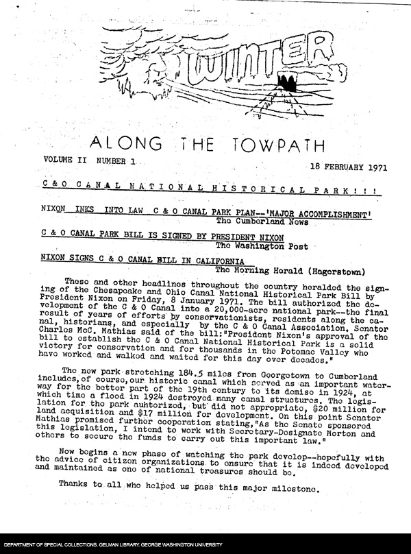 | Description: | The C & O Canal Association's Newsletter, Along the Towpath, volume 2, number 1 issued on February 18, 1971. The newsletter is celebrating the creation of the C & O Canal Historical Park. In January of 1971 President Nixon signed the bill into law. The newsletter contains three newspaper headlines from local papers heralding the achievement. The newsletter thanks all those who were involved in the cause. |