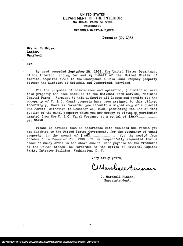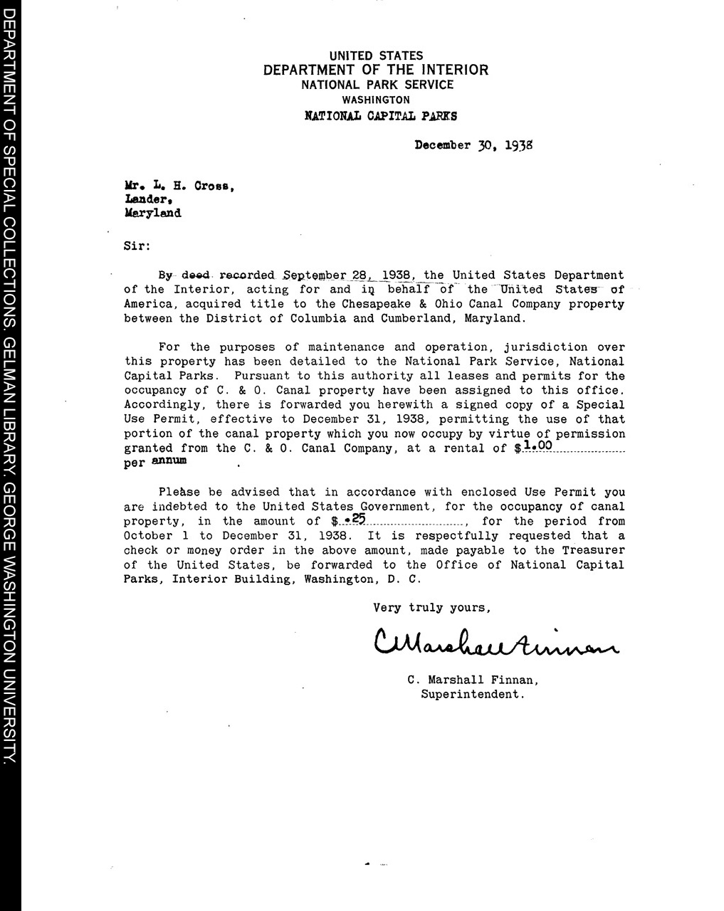 | Description: | Superintendent of the National Park Service Finnan informs Cross of the acquisition of the Canal property by the U.S. Department of the Interior. The letter spells out the new arrangements and costs for Cross' lease of the Canal land. |