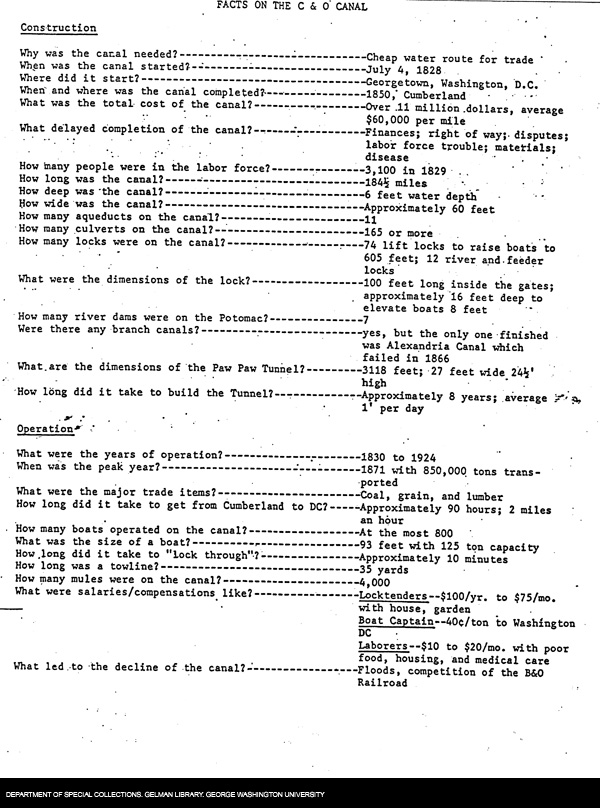 | Description: | A list of facts on the C & O Canal consisting of its construction and operation. |