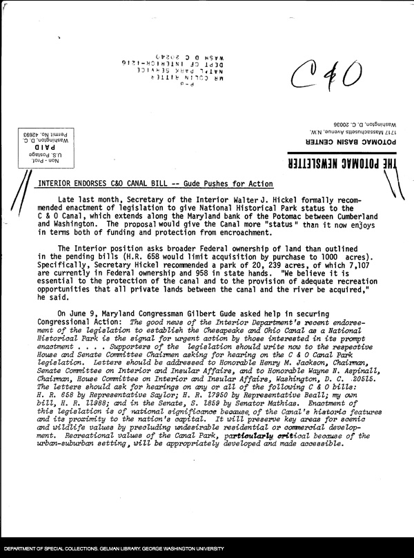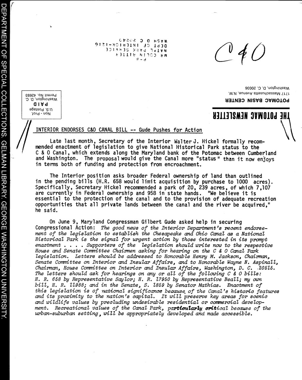 | Description: | An article in The Potomac Newsletter discussing the progress of the C & O Canal Historical Park Bill. The newsletter mentions the Secretary of Interior Hickel formally recommending enactment of the legislation and Maryland Congressman Gilbert Gude's request for help in advancing the bill. |